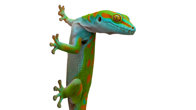 Colorful gecko in vibrant turquoise and green hues with detailed texture on white background for wildlife illustration