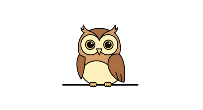 A cartoon owl with large eyes and brown feathers perched on a simple line, looking forward.