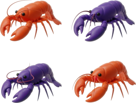 A collection of four colorful toy lobsters in orange and purple.