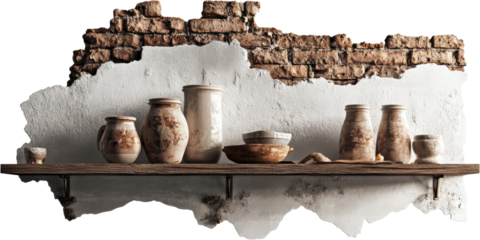 Rustic pottery still life on a weathered wooden shelf against an old brick wall background