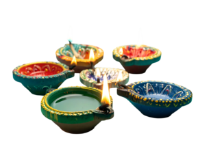 Cultural decorative oil lamps with vibrant flames on transparent background