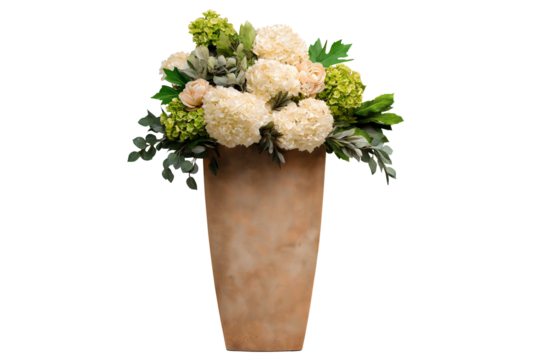 Tall terracotta modern planter urn with peonies, peach roses, green hydrangeas, eucalyptus foliage isolated on transparent background.