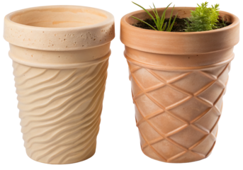 A trio of handmade clay pots in earthy tones, captured in a studio environment with and isolated on a transparent background