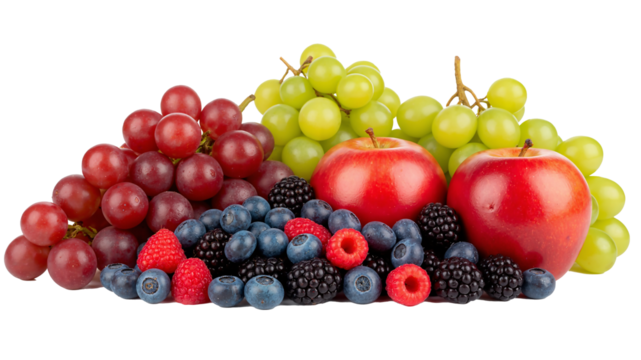 Vibrant Fresh Fruit Assortment: Grapes, Apples, & Berries on Clean White Background
