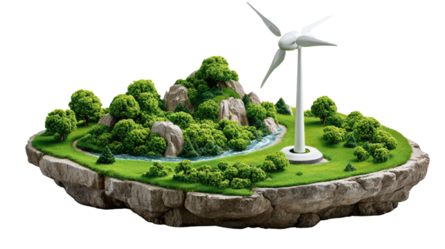 Eco-Island: A miniature island showcases sustainable living with a wind turbine providing clean energy. lush greenery, and a pristine stream flowing through the landscape.
