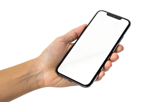 Hand Holding a Smartphone with a Blank White Screen Against a Clean Transparent Background