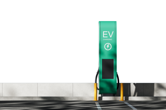Modern electric vehicle charging at EV station isolated on transparent background, symbolizing clean energy, green technology, and eco-friendly transportation for a sustainable future. PNG