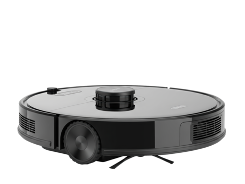 A robotic vacuum cleaner with glossy black finish, visible sensors and wheel base detail, isolated on a transparent background, no logo no brand.