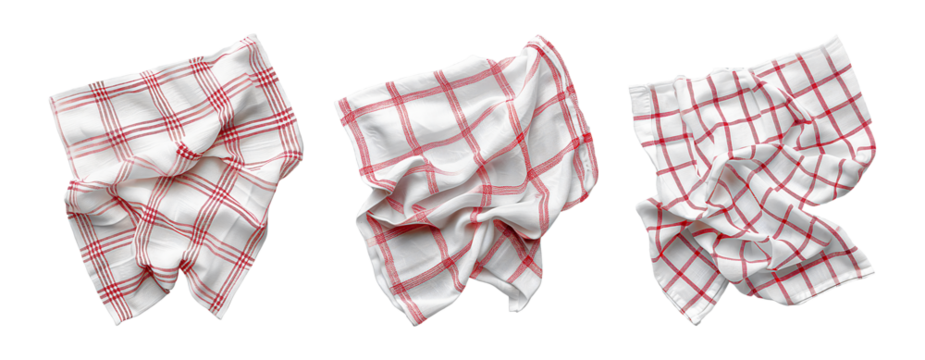 Kitchen towels, three red and white checkered cloths, crumpled and isolated on a transparent background.