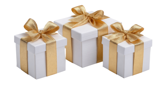 Elegant white and gold gift boxes with decorative ribbons on clean white background, luxury present packaging, festive celebration concept design