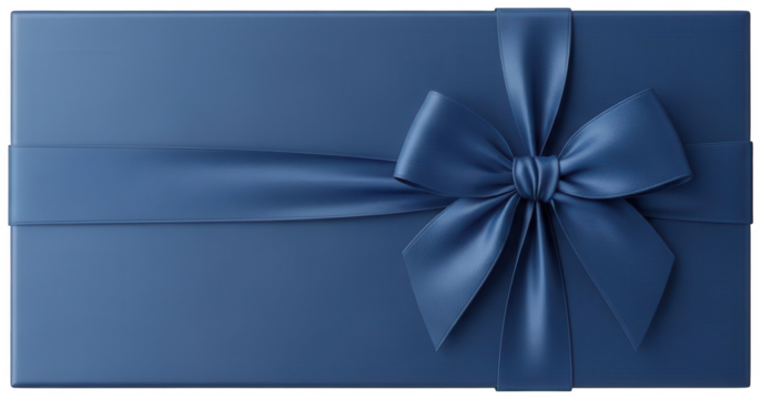 Overhead view of large navy blue gift box with elegant horizontal ribbon and bow