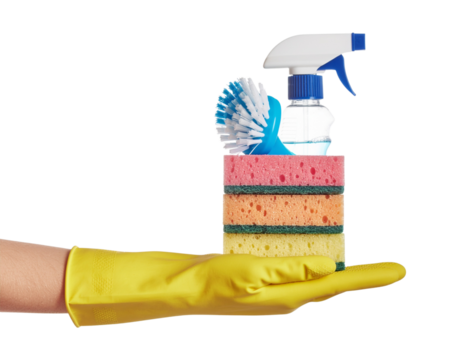 Hands hold cleaning supplies a yellow sponge, a pink microfiber cloth, and an orange rubber glove isolated on transparent background