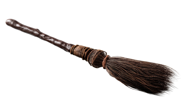 A witchs broom with a wooden handle and straw bristles bound with twine