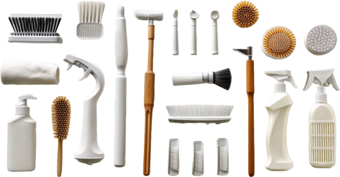 A vibrant collection of cleaning tools including sponges, brushes, and gloves, set against a white background for effective cleaning
