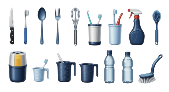 A colorful assortment of cleaning supplies and sponges on a transparent background