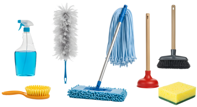 A collection of cleaning tools including a spray bottle, mop, duster, sponge, and brush, arranged on a white background