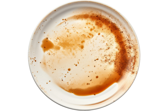 Dirty White Plate With Brown Spots. The dirty white plate is covered in brown spots, indicating dried food residue. On PNG Transparent Clear Background.
