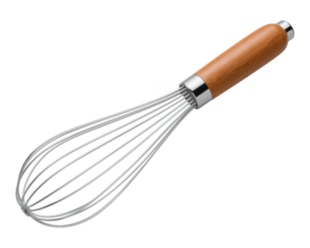 Clean professional metal whisk, mixing utensil product shot PNG isolated on transparent background.