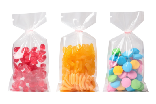Colorful jelly cubes in clear plastic bag isolated on transparent background