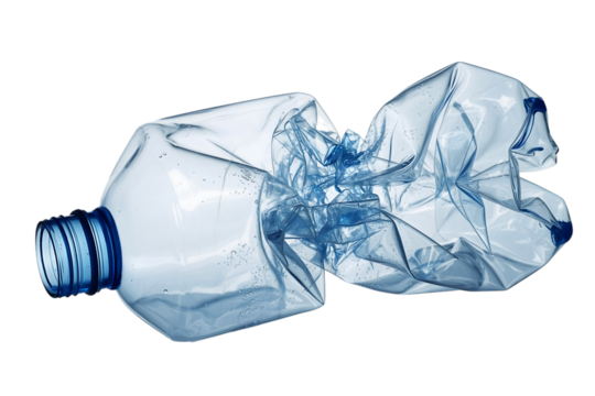 Crushed clear plastic water bottle with blue cap isolated on transparent background