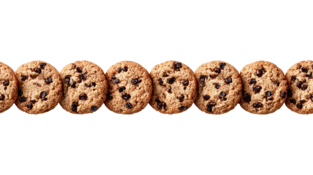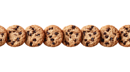 Horizontal row of chocolate chip cookies evenly spaced with clear separation, golden baked surfaces, visible chips, crumbly edges and classic sweet snack texture isolated on transparent background.