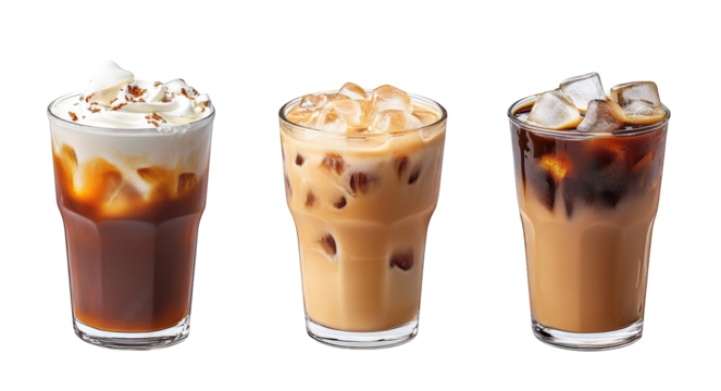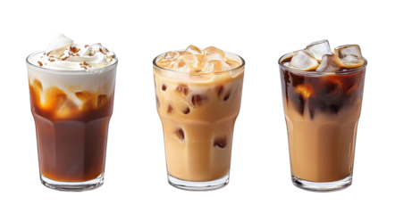 three refreshing iced drinks in clear glasses. showcasing a variety of colors and textures the drinks include a dark iced coffee with cream. a light brown beverage possibly made with milk. and a darke