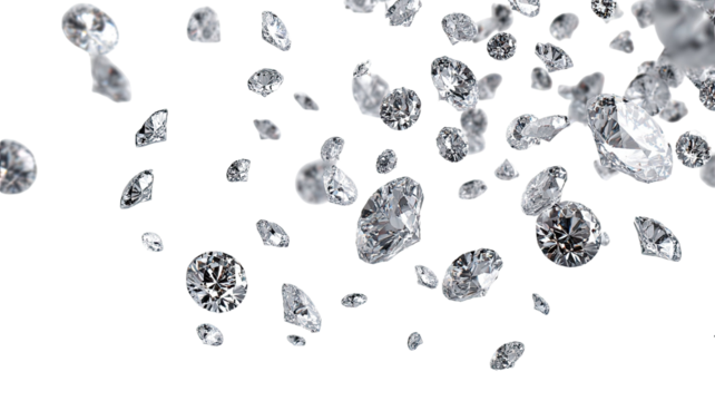 Scattered diamonds spread across surface showing sparkling brilliance clear crystal reflections and luxury gemstone beauty isolated on white background