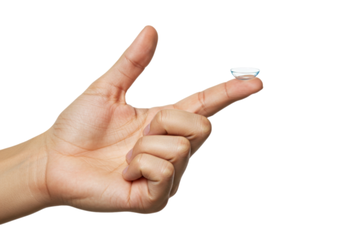 Contact lens on fingertip PNG isolated on transparent background, vision correction and eye care product for ophthalmology and optometry