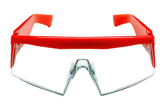 Close-up of protective eyewear with clear lenses and dark arms, isolated on black