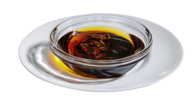 Amber syrup in a small glass bowl on a clean white plate transparent background. Generative AI
