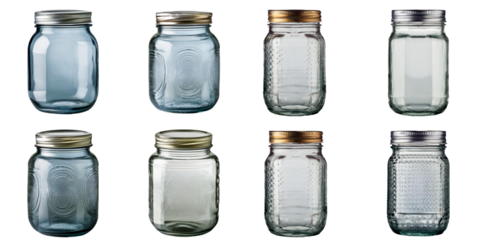 Collection of glass jars with various lids isolated on transparent background