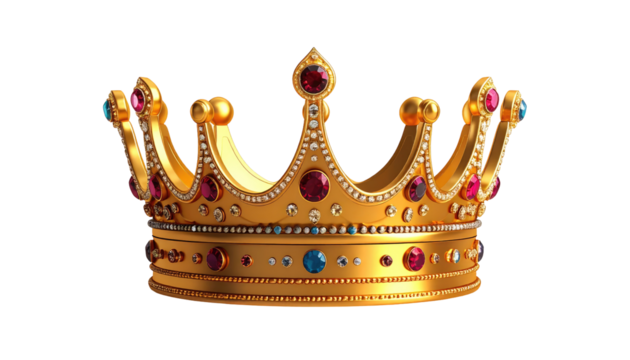 A regal golden crown with multiple sparkling jewels in shades of red, blue, and clear, positioned against a dark backdrop