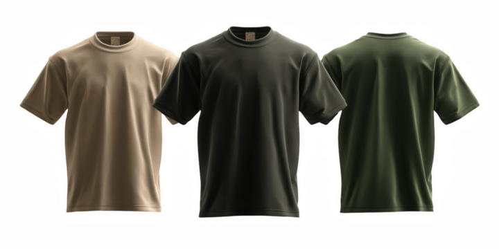 Eye-Level Shot of Three T-Shirts in Assorted Earth Tones, Perfect for Fashion Mockups on transparent background