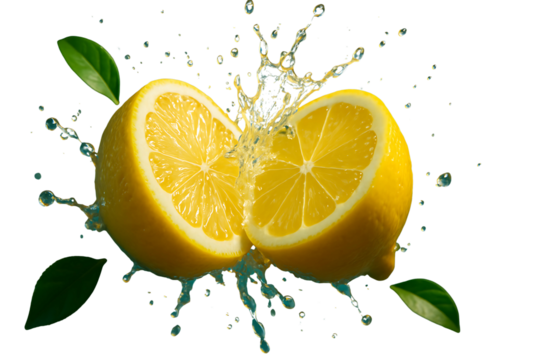 Freshly sliced lemon and lime citrus fruit splashing into cool water