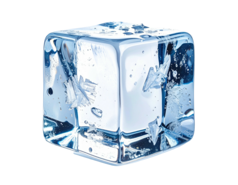 Close-up of a single, clear, square ice cube, showing tiny air pockets and crystalline structures