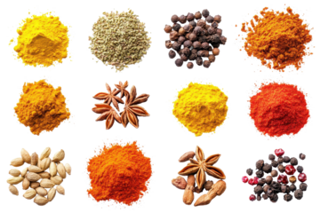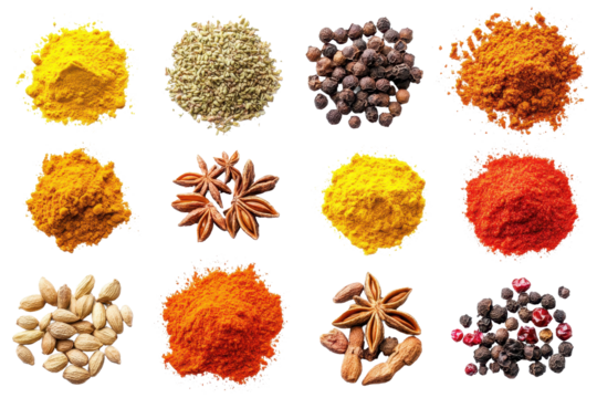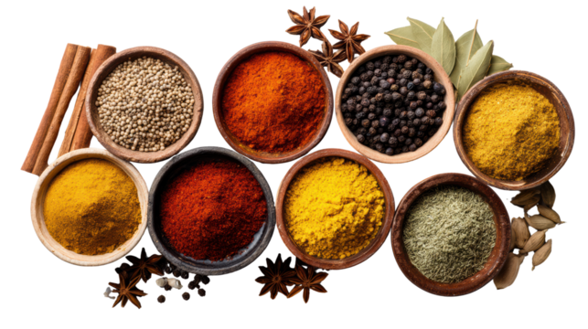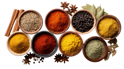 Colorful collection of aromatic spices and seasonings arranged in a beautiful layout showcasing various powder forms and whole spices