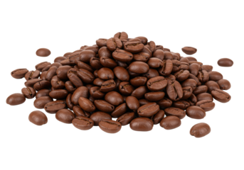 Freshly roasted deep reddish-brown, chocolate-toned coffee beans with oily sheen and clefts, piled and scattered on a transparent studio background with copy space, concept for premium coffee
