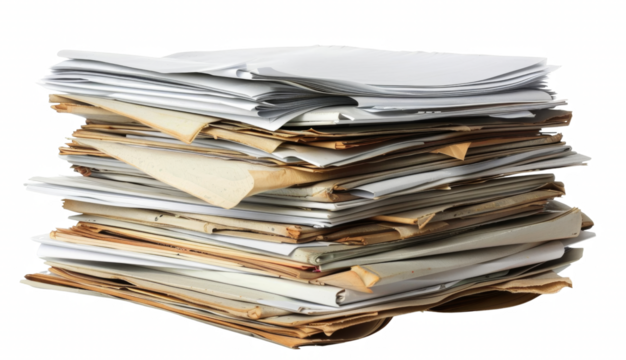 Stack of white and beige papers or documents neatly arranged in multiple layers, isolated on a transparent background