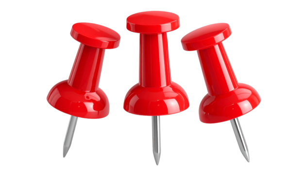 Three vibrant red plastic pushpins arranged closely together, isolated on a clean white background