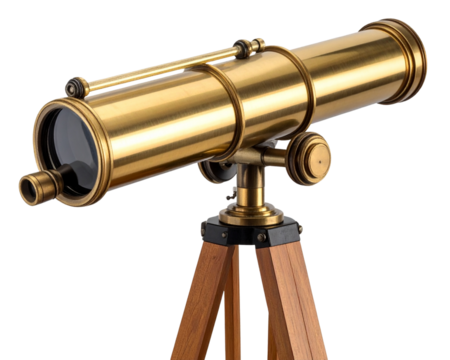 A vintage brass telescope mounted on an extendable wooden tripod, captured from a cle