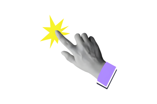 Hand makes click gesture with flash effect. Modern collage style isolated on a white background
