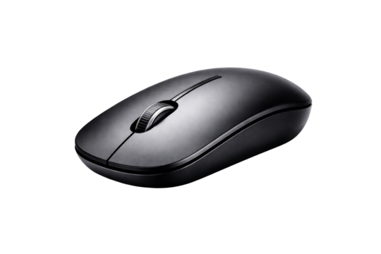 Computer mouse with a sleek ergonomic design, scroll wheel, and clickable buttons. Isolated on a transparent PNG background.