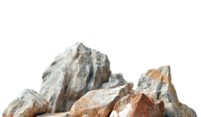 Rough pile of fractured grey granite rocks with visible cracks and textured surfaces transparent background