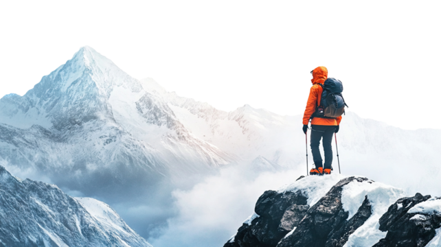 Hiker standing on snowy peak, overlooking mountain range, cut out