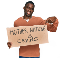 Young african american man holding mother nature is crying protest cardboard banner celebrating victory with happy smile and winner expression with raised hands