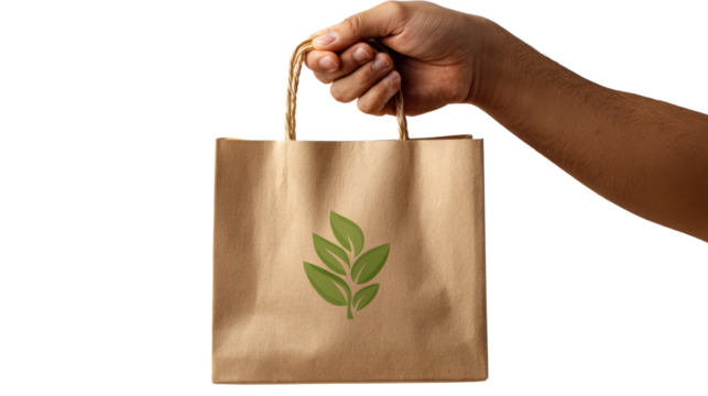 Eco-friendly shopping bag hanging on white chair with transparent background