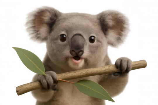 Adorable baby koala grasping a eucalyptus branch with a look of astonishment, set against a clear background