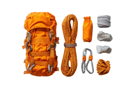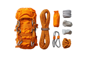 Essential Gear: An organized arrangement of crucial outdoor climbing equipment. It features a rugged backpack, durable rope, sturdy carabiners.