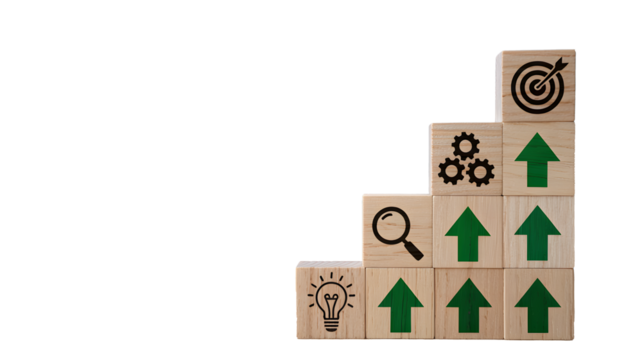 Wooden block pyramid reaching for the top with a success flag and star cutout, symbolizing achievement and goal setting
