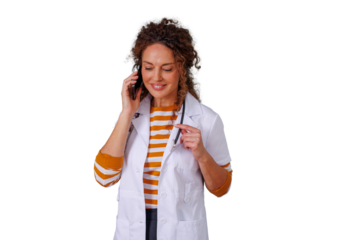 Female doctor receiving phone call, wearing lab coat and stethoscope, smiling, healthcare professional communicating remotely